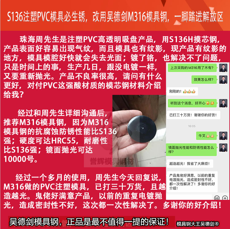 經(jīng)過和周先生詳細(xì)溝通后,推薦M316模具鋼, 經(jīng)過一個(gè)多月的使用,周先生今天回復(fù)說:M316做的PVC注塑模具,已打三十萬貨!越造越光!產(chǎn)品鬼佬好滿意,以前的重復(fù)電鍍拋光,造成密封性不好,都一次性解決了!多謝你的好介紹!