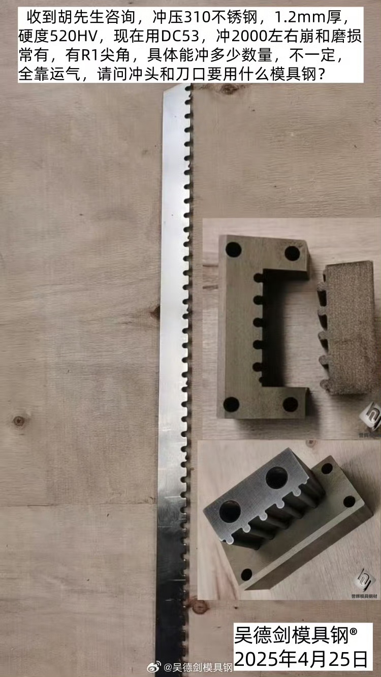 收到胡先生咨詢,沖壓310不銹鋼,1.2mm厚,硬度520HV的鋸齒產(chǎn)品,現(xiàn)在用DC53,只能沖2000左右,崩和磨損常有,有R1尖角,具體能沖多少數(shù)量,不一定,全靠運氣,請問沖頭和刀口要用什么模具鋼?