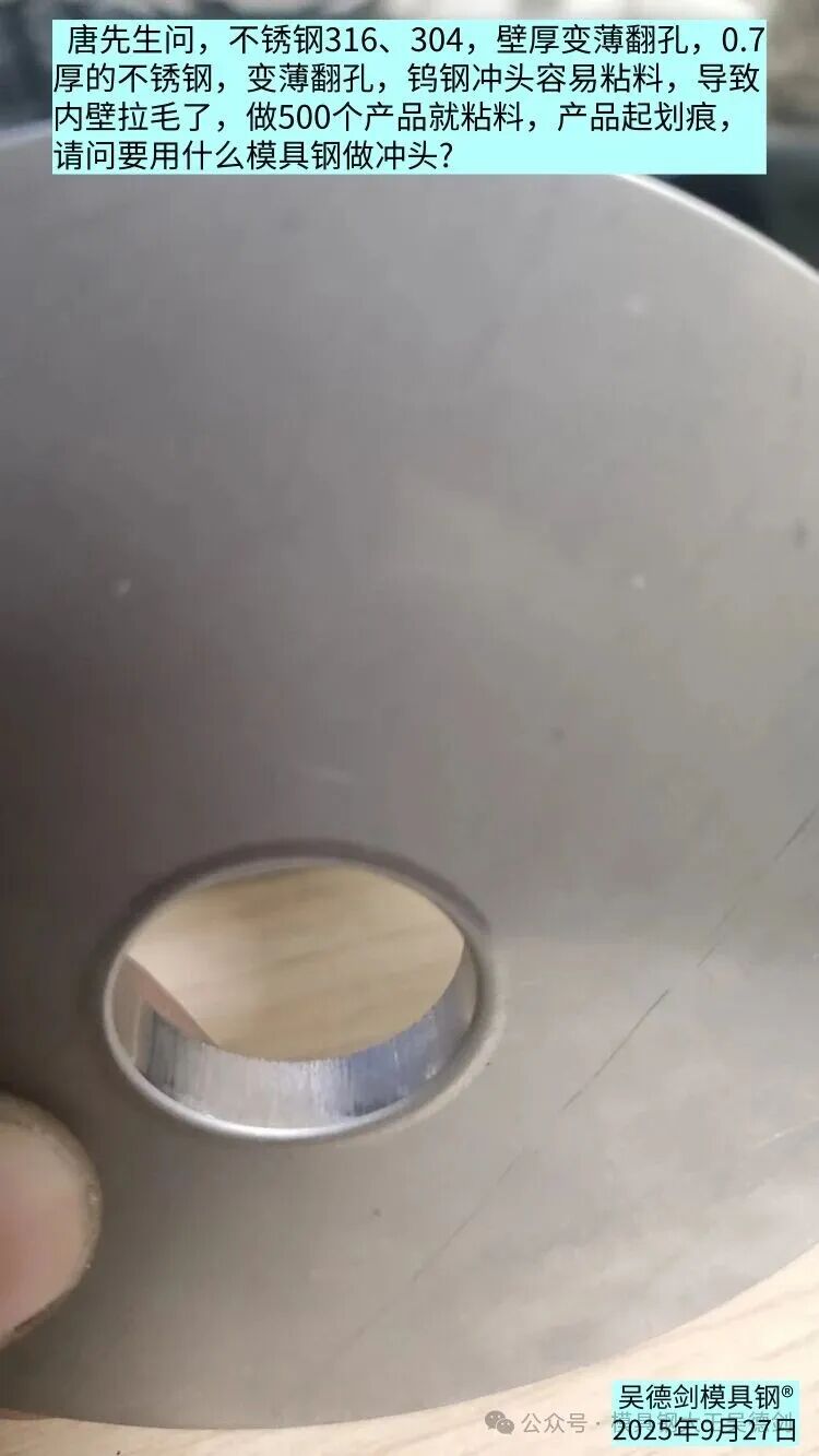 進(jìn)一步細(xì)聊后得知,0.7厚的不銹鋼316、304,壁厚變薄翻孔,鎢鋼沖頭容易粘料,導(dǎo)致內(nèi)壁拉毛了,做500個產(chǎn)品就粘料,產(chǎn)品起劃痕,做了一個SKH51的沖頭,加了涂層的,出現(xiàn)粘料后,又做了一個鎢鋼沖頭,都是這個情況,請問翻邊沖頭要用什么模具鋼做沖頭?