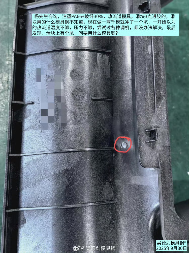 收到楊先生咨詢,注塑PA66+玻纖30%,熱流道模具,滑塊3點(diǎn)進(jìn)膠的,滑塊用的什么模具鋼不知道,現(xiàn)在做一兩千模就沖了一個(gè)坑。一開(kāi)始以為的熱流道溫度不夠,導(dǎo)致流動(dòng)性不夠,又以為壓力不夠,嘗試過(guò)各種調(diào)機(jī),都沒(méi)辦法解決,最后發(fā)現(xiàn),滑塊上有個(gè)坑,問(wèn)要用什么模具鋼?