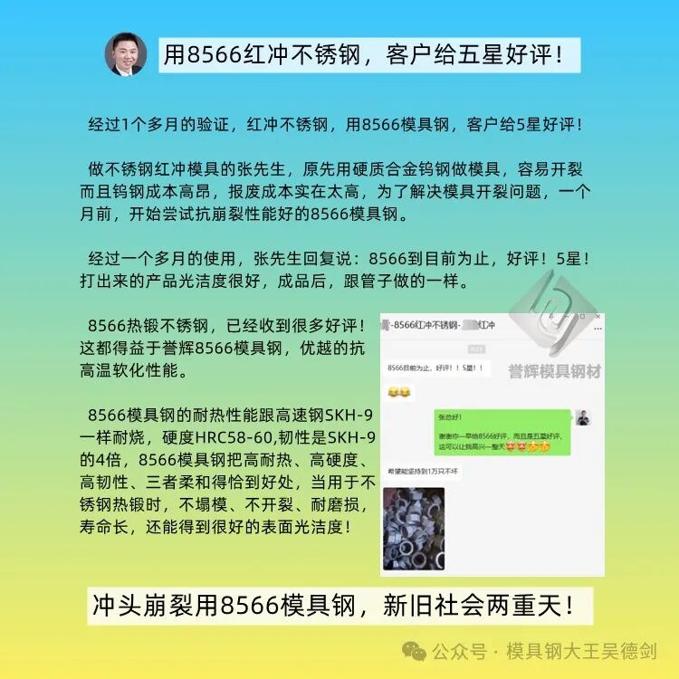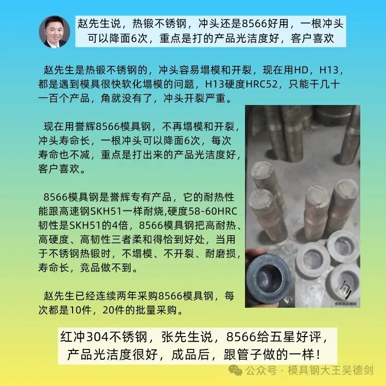 但后來用譽(yù)輝8566模具鋼,不再塌模和開裂,沖頭壽命長,一根沖頭可以降面6次,每次壽命也不減,重點(diǎn)是打出來的產(chǎn)品光潔度好,客戶喜歡。