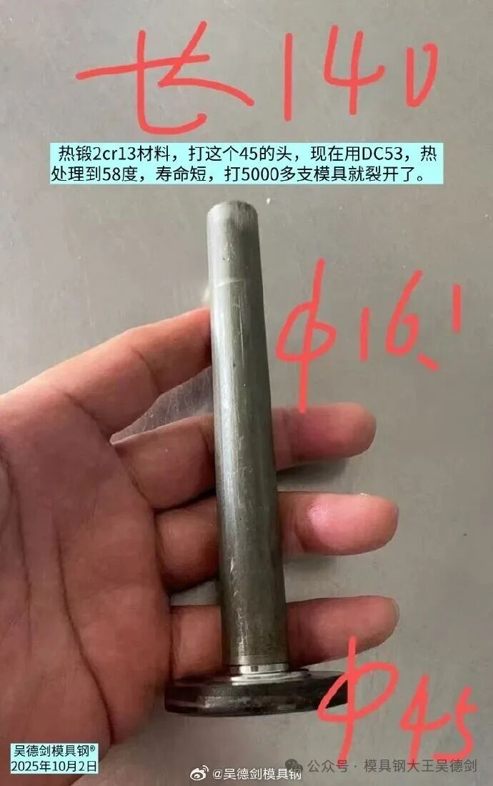 收到網(wǎng)友咨詢問:熱鍛2Cr13材料,打這個(gè)45的頭,現(xiàn)在用DC53,熱處理到58度,壽命短,打5000多支模具就裂開了。
