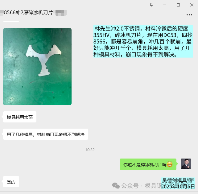 加上好友,發(fā)來產(chǎn)品,一眼就認(rèn)出是碎冰機(jī)刀片,這個產(chǎn)品我們幾年前就解決了崩裂問題,又剛剛有客戶來采購,太熟悉了。